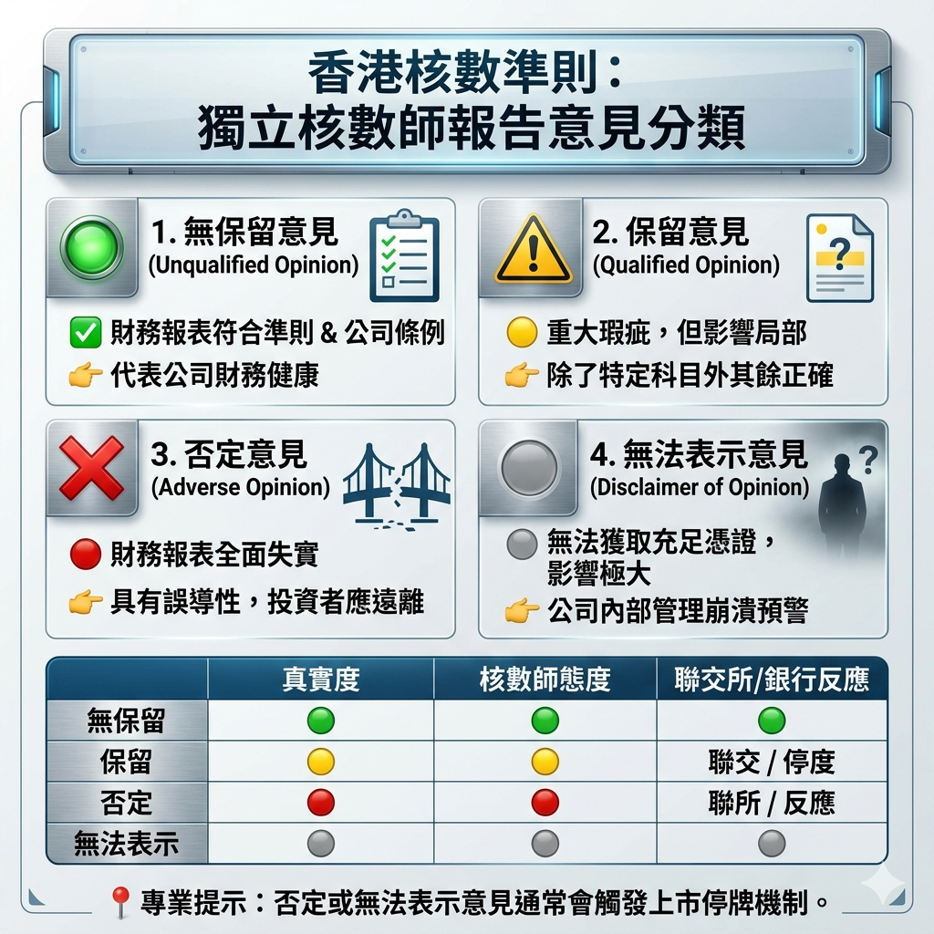 會計師對公司財務報表出具報告時,常見的「意見類型」主要分為四大類:無保留意見、保留意見、否定意見、無法表示意見。這些意見用來反映會計師對財務報表是否「可靠、真實及公平地反映」公司狀況的看法。